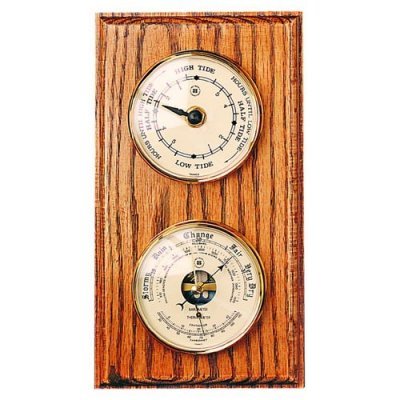 Be on top of all the environmental variables with the Manistee Weather Station. Pair a tide clock a barometer and a thermometer together and know the whole weather picture with the blink of an eye. The solid wood base of this piece holds inset instruments that can rotate for either vertical or horizontal orientation. The tide clock is a single instrument and indicates tide level and hours until tide change. A French precision barometer and thermometer are combined on one instrument with barometric pressure meter on top and thermometer below. Temp readings are accessible in both Fahrenheit and Centigrade. Both instruments are lined with solid tarnish-proof brass housings and have beautiful ivory faces with black script. The barometer has an exposed center that shows mechanical details. Barometric Pressure Tide Temperature Flexible orientation and great information pair perfectly in the Manistee Weather Station.