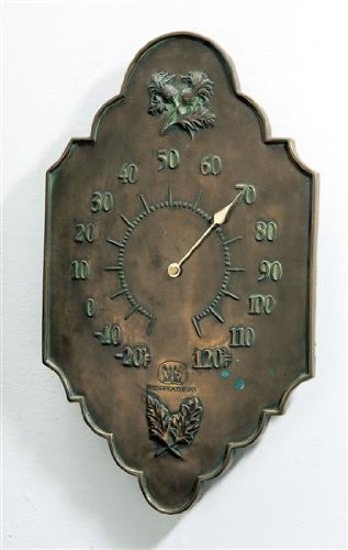 73415HWTB Color: Bronze Thermometer displayed with copper finish The durability of this outdoor thermometer is matched by its traditional beauty. Featuring an antiqued finish - available in copper or bronze - this thermometer has a familiar old-time feel. The gold toned hand that adorns the front of the piece accents the finish. This thermometer features hand carved raised thistle accents on its top and bottom, is handcrafted from cold cast metal, and weather resistant. These features combine to form an amazing thermometer suitable for any outdoor space! Thermometer Features: -Available in antiqued copper or bronze finish. -Handcrafted from cold cast metal. -Weather resistant construction. -Hand carved thistle accents. -Gold toned hand. -Thermometer dimensions: 15.25'' H X 9.5'' W x 1.5'' D.