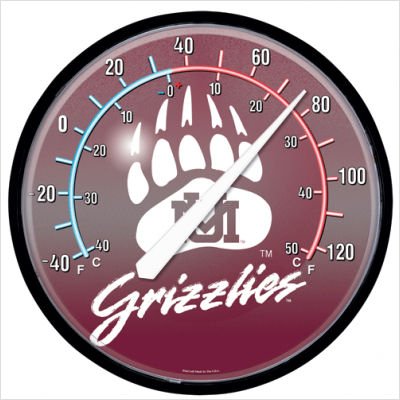 0855271 Team: University of Montana Shown in University of Alabama Features: -Officially licensed thermometer. -Features official logos and colors of your school. -Great fan item to measure the temperature. -All plastic construction with a built in hanger. -Comes ready to hang outdoors. -Made in USA. -Diameter: 12.75''.